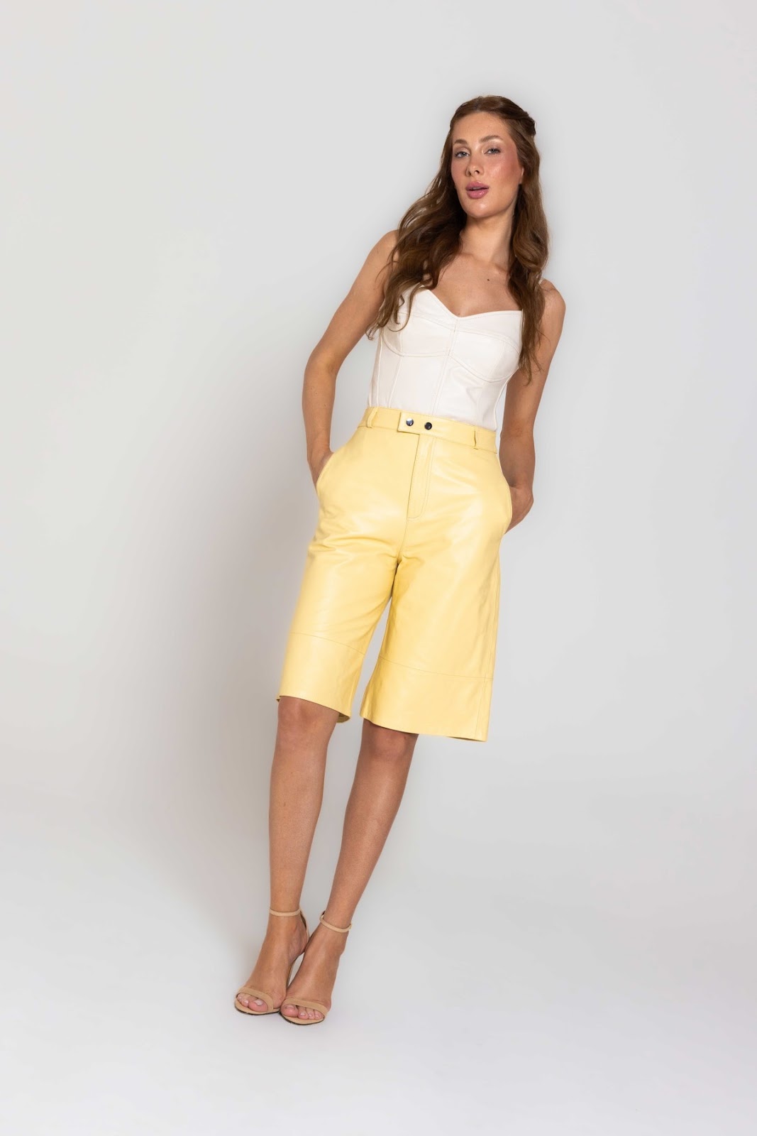 Para quem prefere um comprimento um pouco maior, a bermuda de couro feminina é uma opção elegante e extremamente versátil. Com uma camisa branca e um loafer, vira um look perfeito para um almoço de trabalho. Com uma camiseta de algodão e tênis, fica moderna e descomplicada para o fim de semana.
